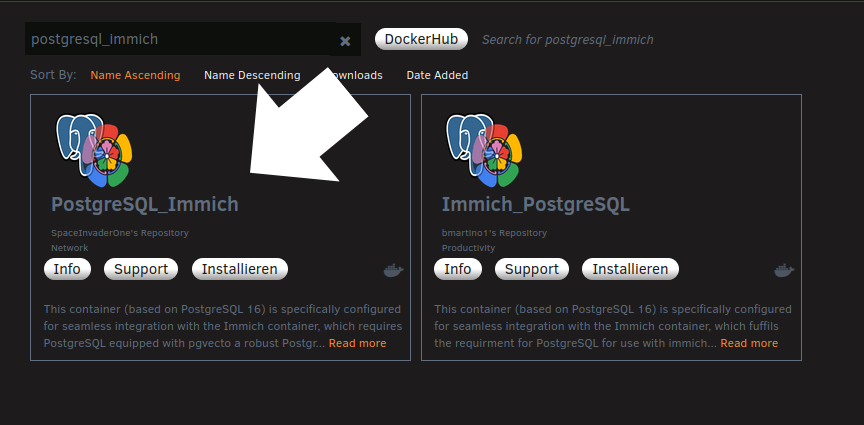 Im Unraid App Store sucht ihr nach PostgreSQL_Immich und wählt das Template von SpaceInvaderOne's.